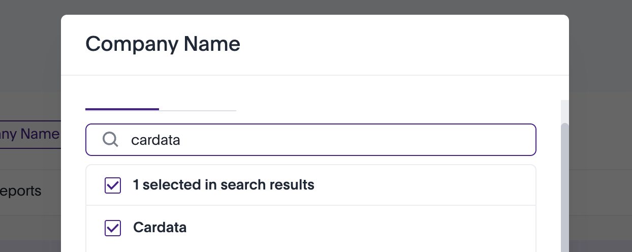 The Cardata Intelligence dashboard consists of two sections: Program Overview and Compliance (for report visualizations) and Detailed Reports (for in-depth data tables). You can apply filters to the entire dashboard using the options at the top of the page.Here's how:- Select the Company Name Start by selecting the Company Name. Begin typing the company name into the search field and choose the correct result from the dropdown