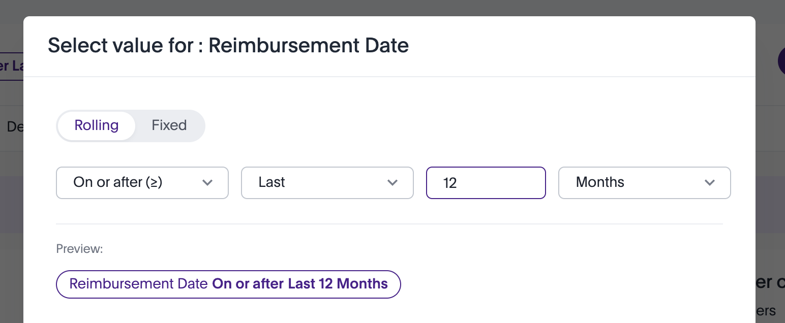 - Filter by Reimbursement Date Apply a filter for Reimbursement Date using the same Rolling or Fixed logic.