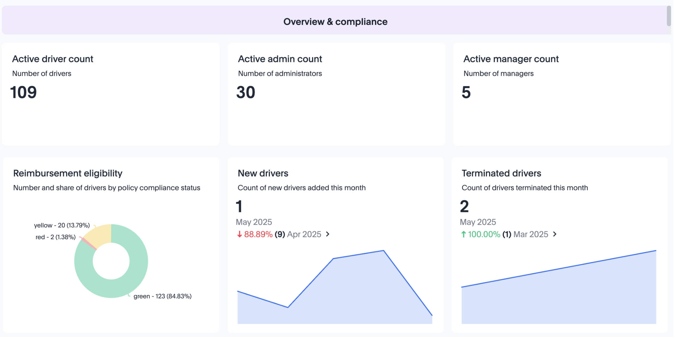- Monthly Participation Trends: rend cards show activity over time, such as new drivers added or off-boarded. Example: “1 new driver added, 2 off-boarded in May.”