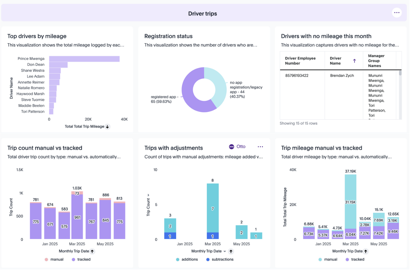 Compare manual versus automatically tracked trips to assess driver compliance and tracking adoption.