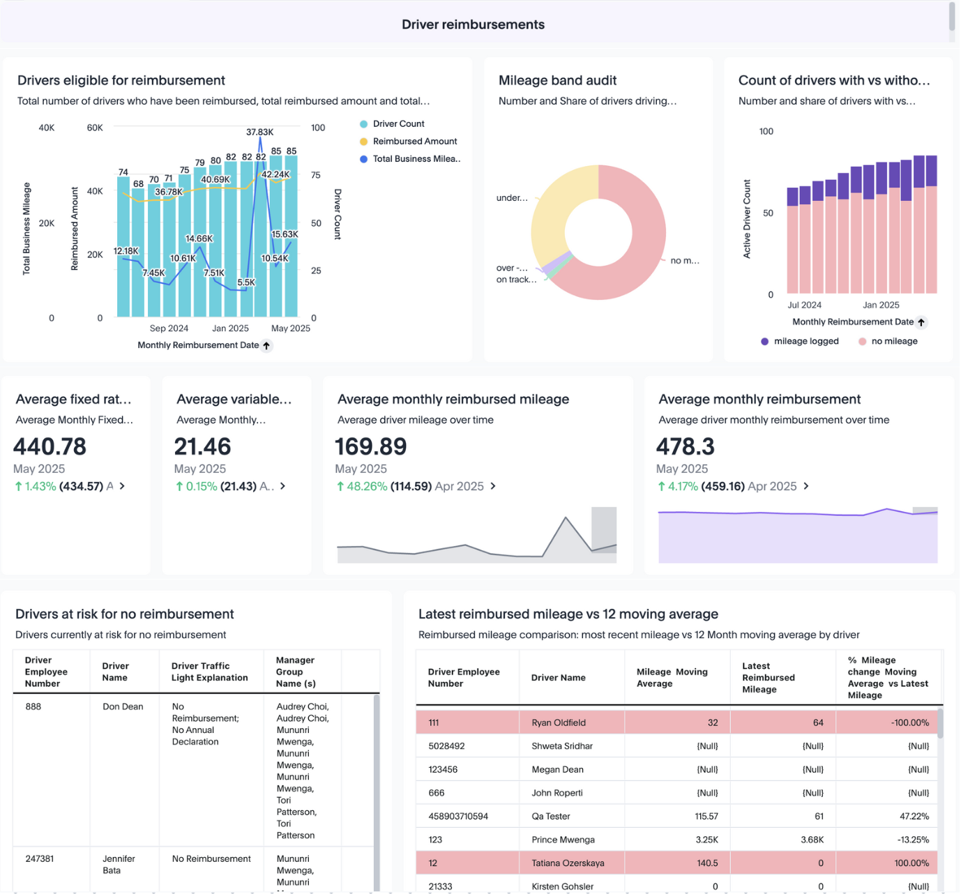 Track how average reimbursed mileage per driver is trending month over month.
